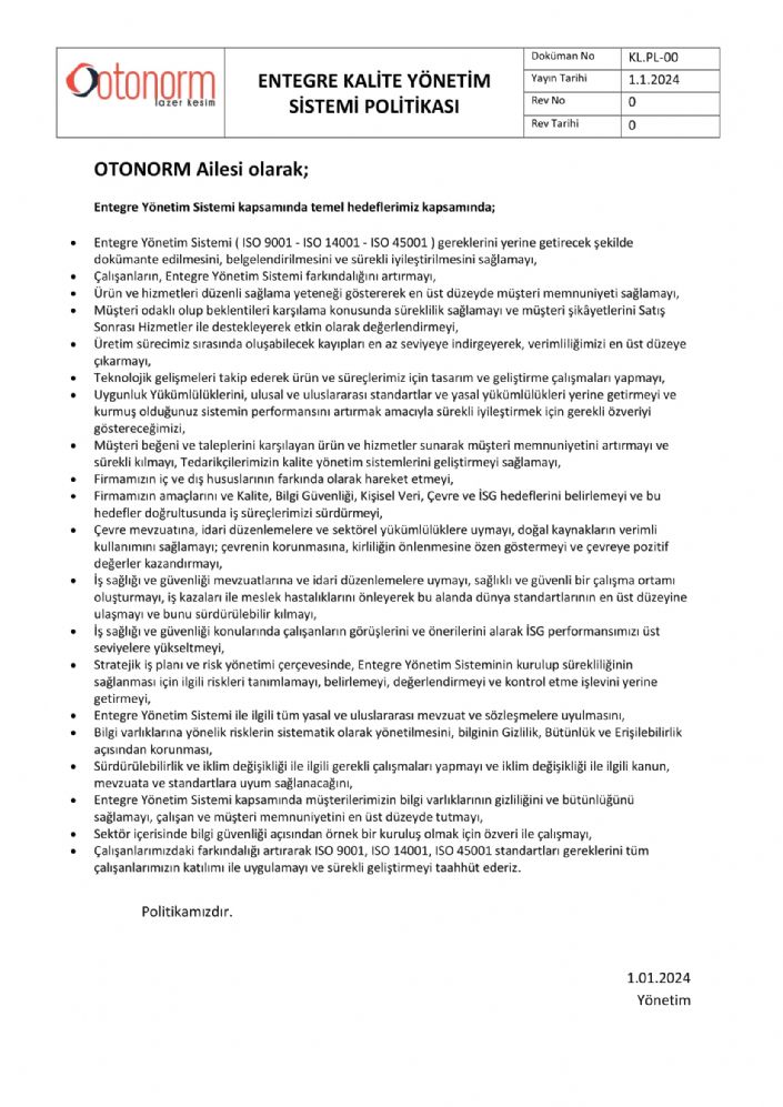 Entegre Kalite Yönetim Sistemi Politikası